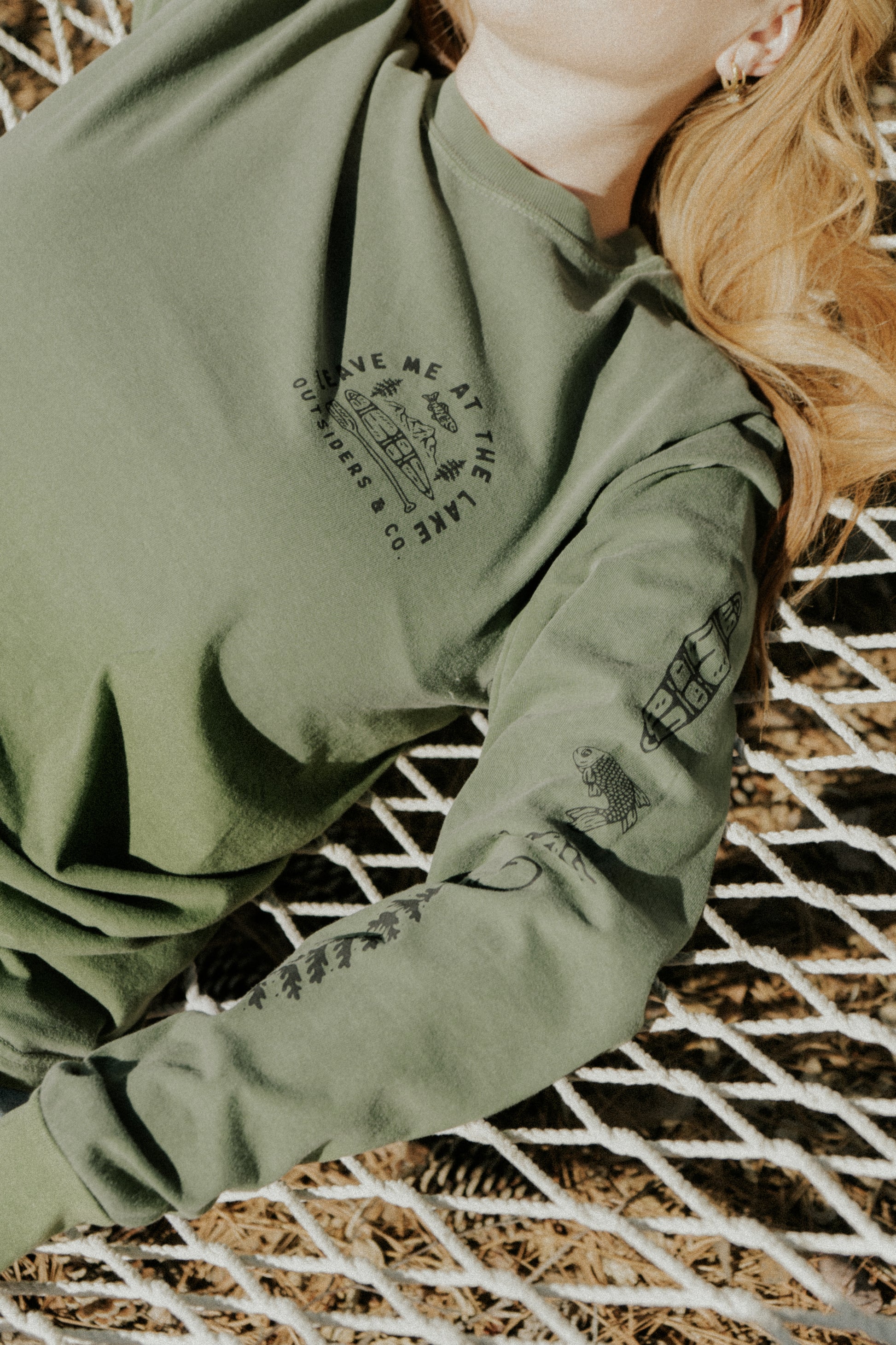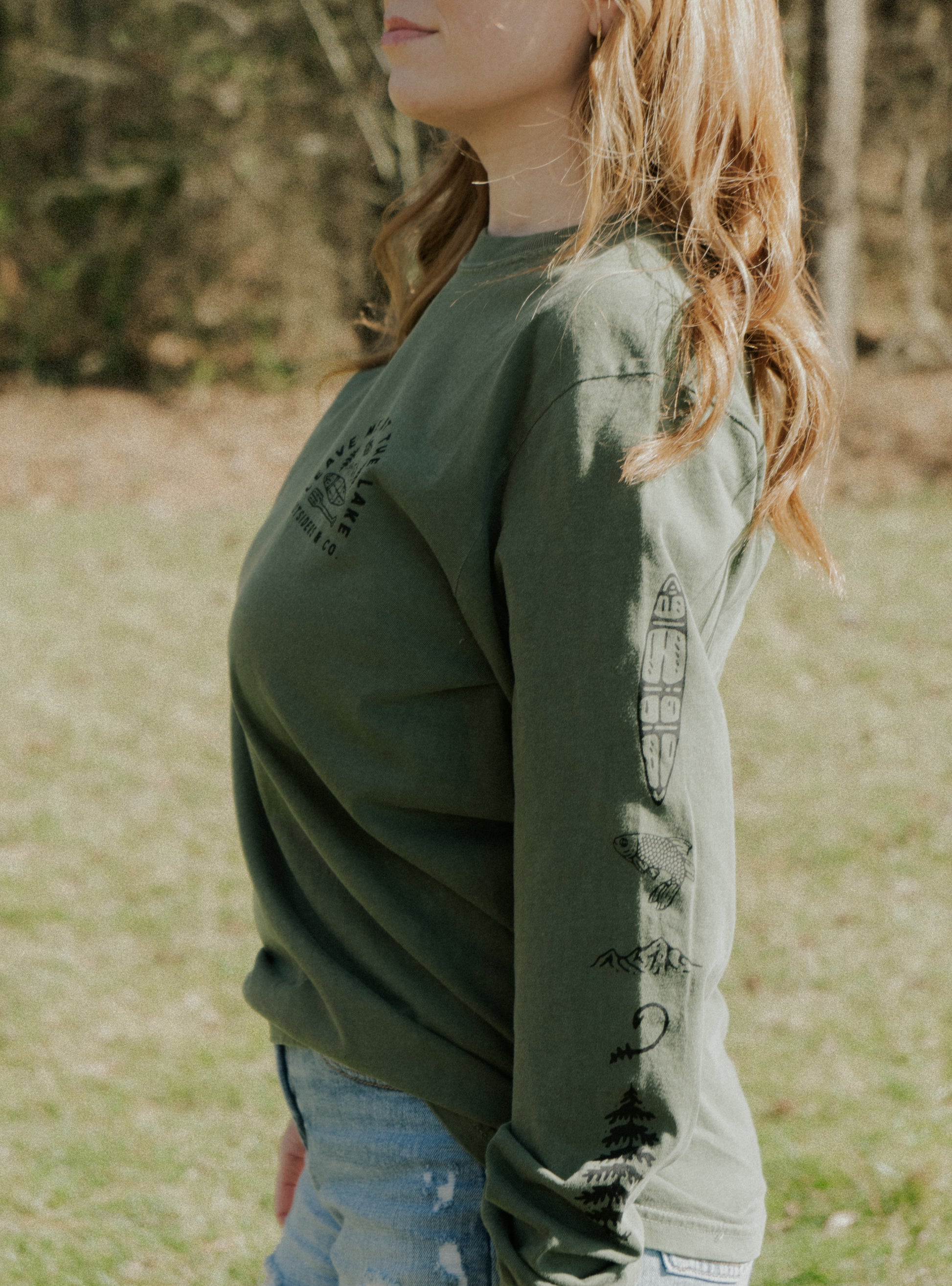 This long sleeve tee comes in two color options and features fun lake icons down both sleeves!